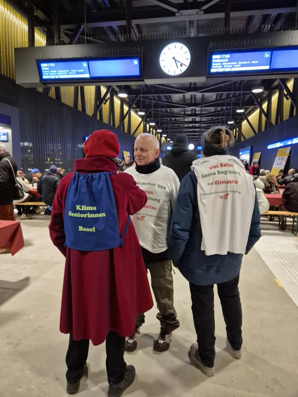 Aktivist*innen der Lokalgruppe Gundeli-Bruderholz und der Klimaseniorinnen forderten am Apero der SBB für die Gundeli-Bevölkerung eine Begrünung und Beschattung des Meret Oppenheim-Platzes.